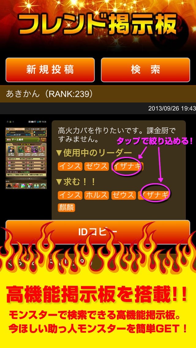 IDを書き込んで投稿するもよし、IDをコピーしてフレンド申請するもよし、検索機能を備えた万能掲示板です。