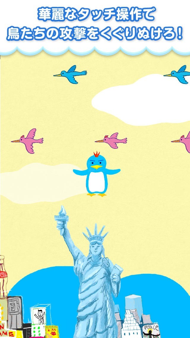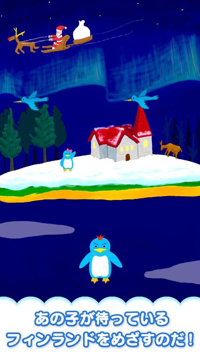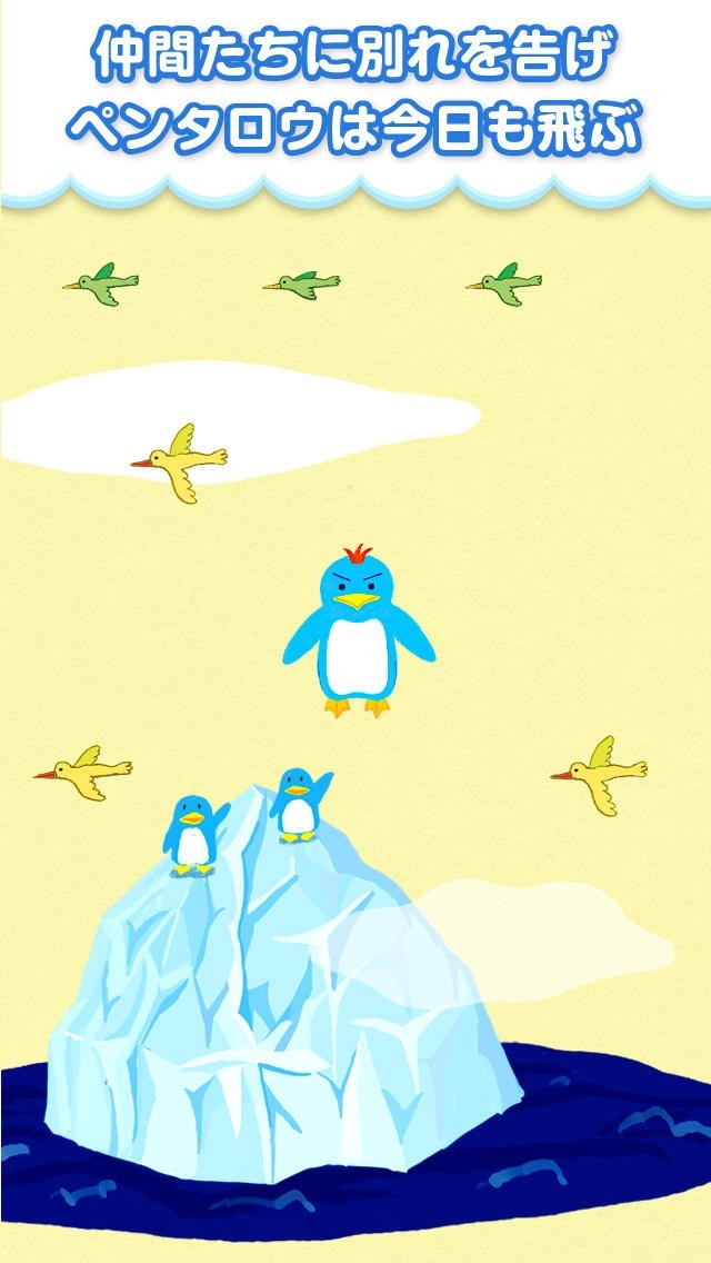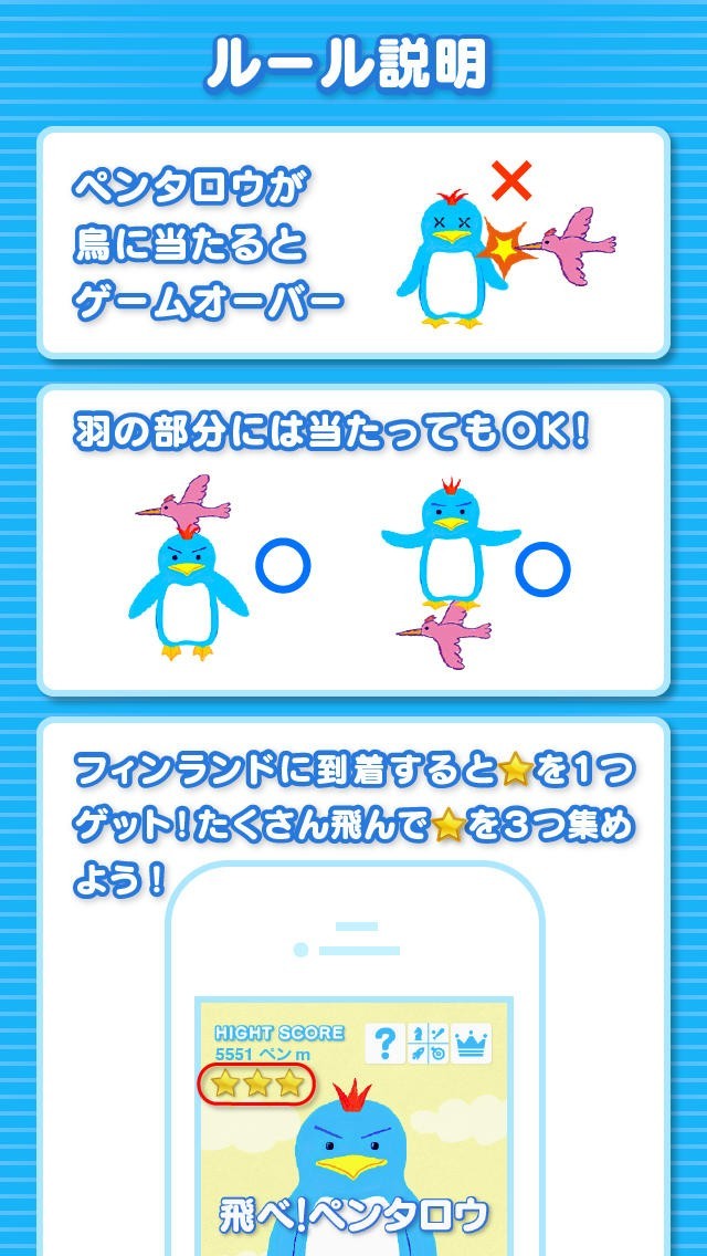 ペンギンのキャラクター「ペンタロウ」を彼女が待つフィンランドまで導いていくゲームです。画面をタップするとペンタロウが空へと上昇し、指を離すと下降して行きます。うまくタップを続ければホバリングもできます。 空には鳥が飛んでいて鳥に当たってしまうとゲームオーバーですが、羽の部分はセーフです。飛ぶスピードや出現タイミングが異なる鳥が登場します。 フィンランドに到着するとスターがもらえ、3個集めるとシークレットモードが解放されます。