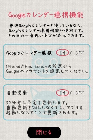 Googleカレンダーに登録された予定を、かれんにゃーに表示できます。ホーム画面にある「設定」からアカウントを入力してください。