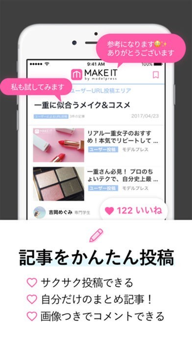メイクイットのオリジナル記事だけでなく、他メディア記事やコスメの公式サイトなどもシェアできます。