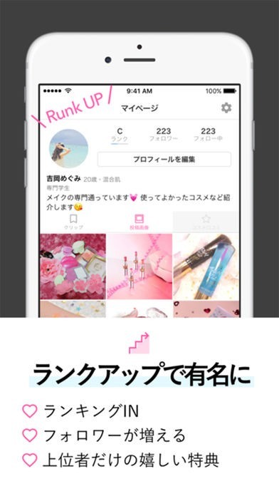 「トレンドをいち早く取り入れられる、伝えたいことを簡単に発信できる、ランクUPで有名になれる」可愛くなることに貪欲な女の子のための『美容アプリの決定版』。
