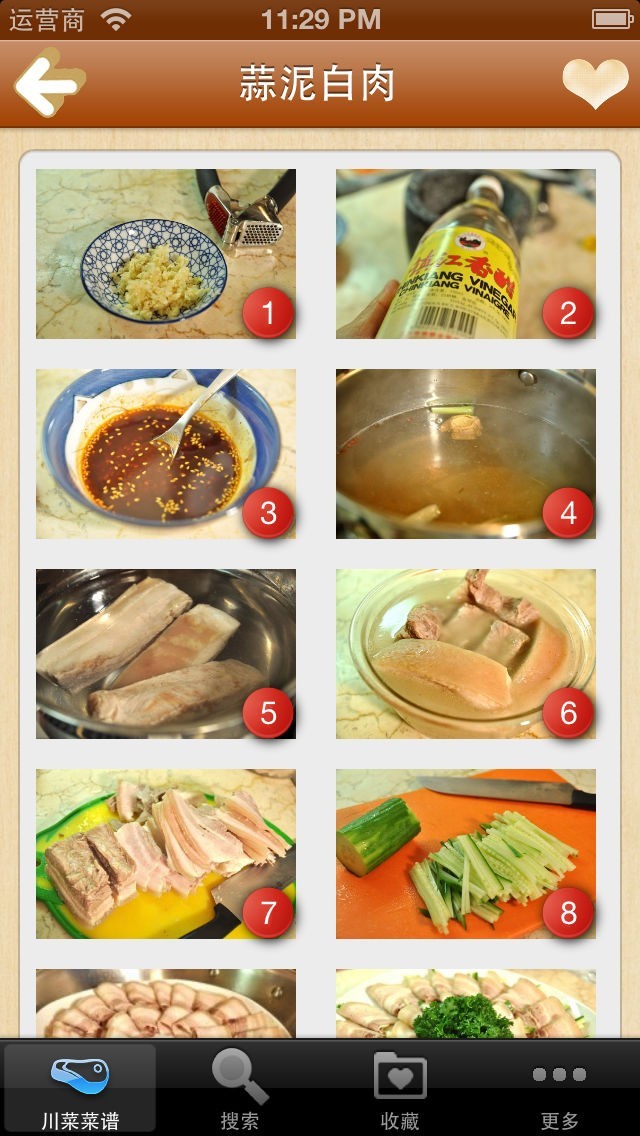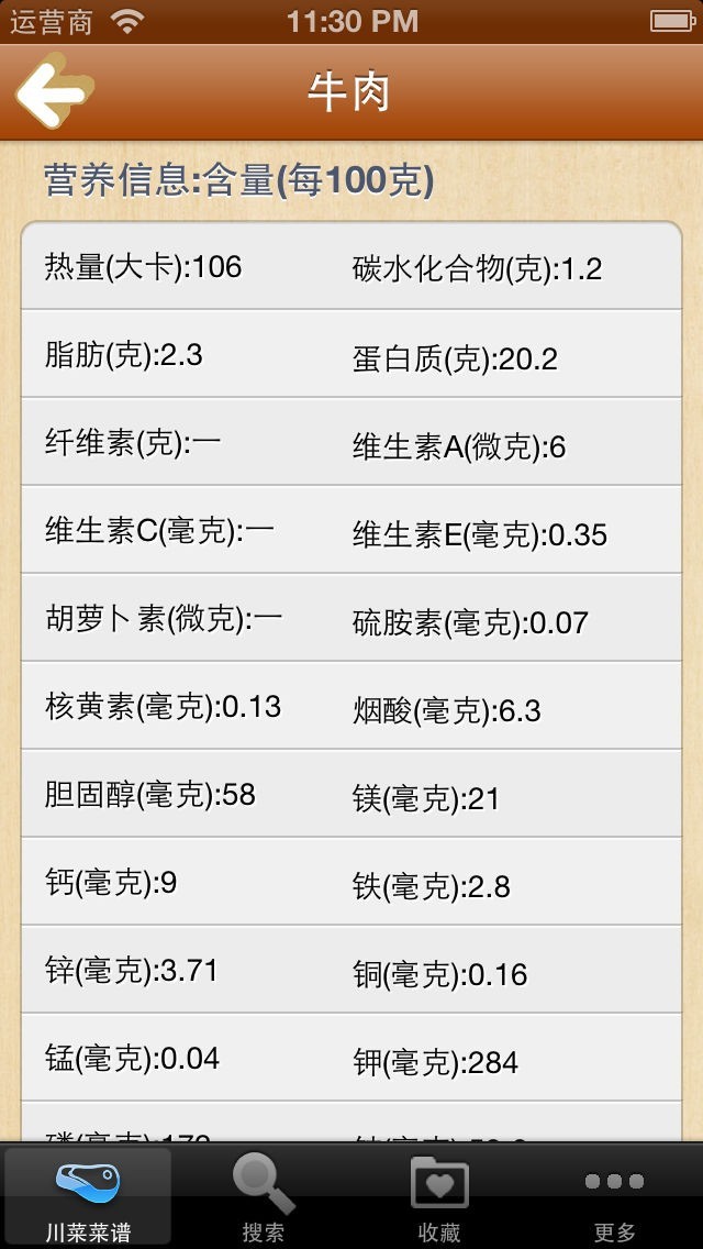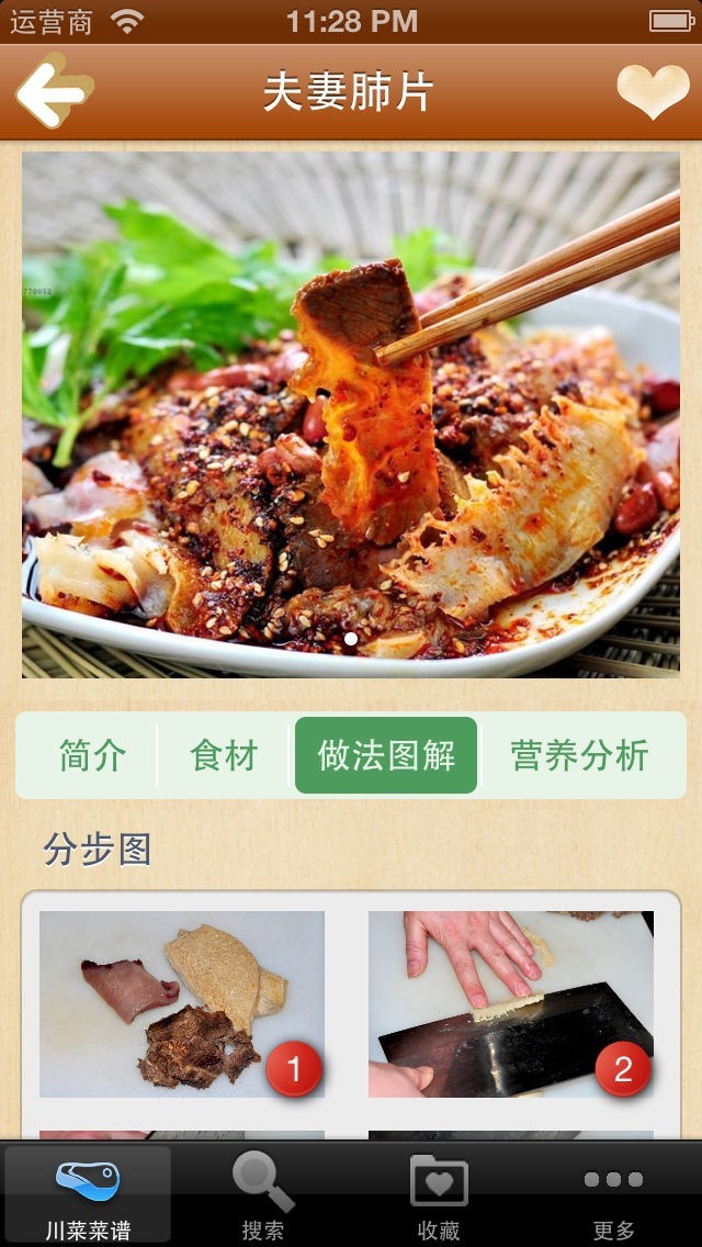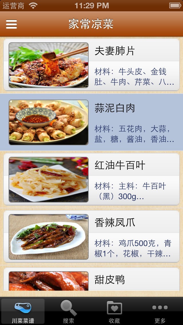 App Storeより引用精心挑选川味家常菜及火爆流行菜式,按原料细分家常凉菜、经典小炒、猪肉类、牛肉类、水产类、素菜类、小吃类等七大类,每道菜式均配精美图片,按步骤详细讲解,每步并配有相应图片,保证可以成功操作100%,有图有真相,以及所用的食材的营养分析,是您的川菜烹饪宝典。