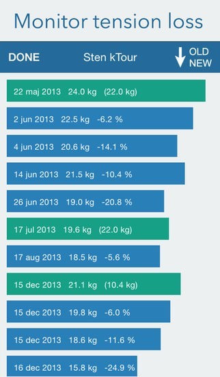 測定した数値は測定日時と共に記録されるので、テンションの落ち方を見ることができます。グラフで表示することも可能なので、分かりやすく推移を確認して張り替え時を知ることができます。