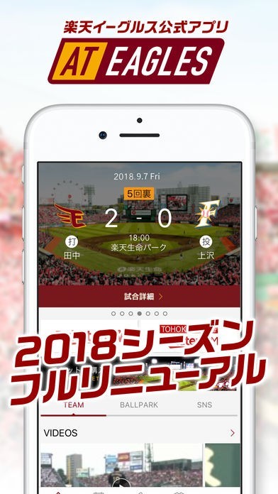 「At Eagles」はプロ野球の東北楽天ゴールデンイーグルスのファンなら必見のコンテンツが満載のアプリになります。TEAM機能ではゴールデンイーグルスの選手プロフィールや成績、試合情報を確認することが出来るようになっているほか、試合のハイライトやファインプレイを動画でチェックすることが可能になっています。