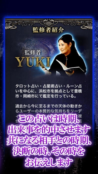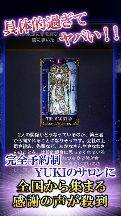 多数のTVや雑誌に登場し、多くの芸能人にも信頼されている有名占い師YUKI先生が占ってくれるアプリです。その占い結果は、すごく当たるうえに具体的だと評判です。困りごとがあったら使ってみてください。