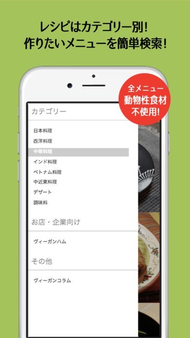 「VeganJapan -日本語版」は、動物性食材を使わないVEGANレシピに特化したレシピアプリです。カテゴリー機能を搭載しており、日本料理、西洋料理といった各カテゴリーからレシピを探せます。