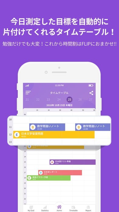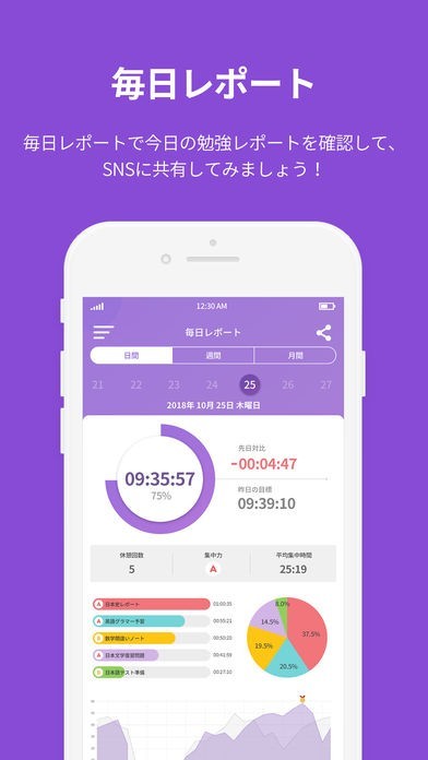 今日はどれくらいの時間集中して取り組むことができたか、また目標を達成できたかどうかをアプリが自動で計測して作成したレポートをシェアすることで、友だち同士のやる気アップにつながります。