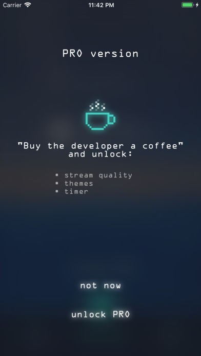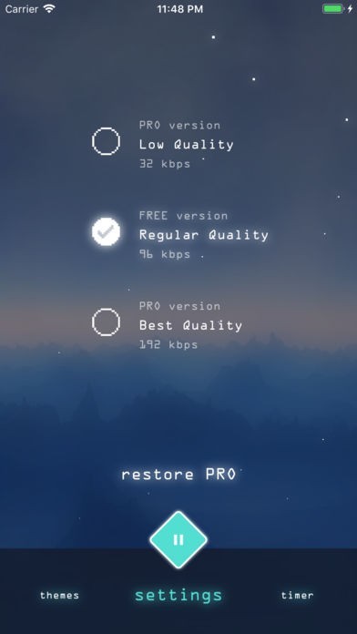 PRO Version (one time payment): Timer to shutdown app; Themes (wallpapers); Ultra Lo-fi mode and HD mode;