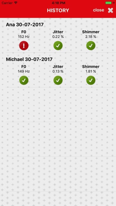 If results are not green, repeat the procedure several times. If warning persists, it indicates that the voice parameters are different from standard values and you should visit your doctor.