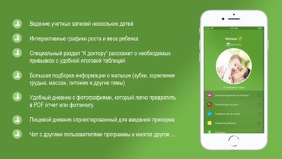 - В программу встроен Дневник, в который можно заносить достижения малыша, рекомендации врача, сделанные прививки, замеры температуры, напоминания, добавлять фотографии, биометрические данные, болезни, вес и рост. При этом занося вес и рост – они автоматически отобразятся в виде графика, серьезные болезни попадут в «Анкету малыша» и через некоторое время ненужно будет вспоминать чем и когда ребенок болел, биометрические данные программа использует для определения размера одежды и т.д..