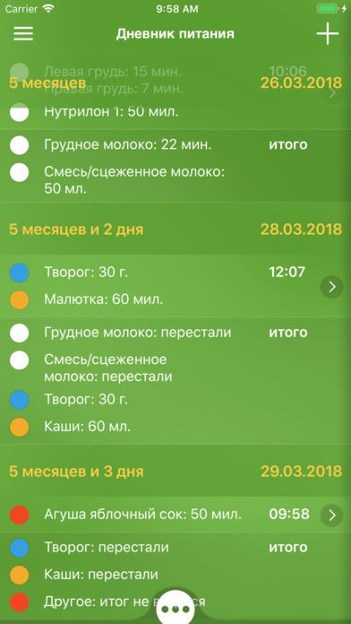 - Раздел "Кормление грудью и прикорм" - это дневник питания с группировкой данных по 4 основным группам: