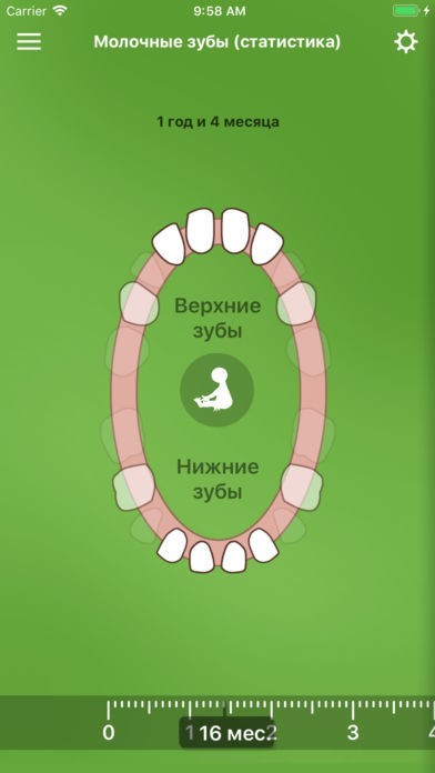- Раздел "Зубы" дает возможность проследить динамику появления и выпадения молочных зубов. Есть возможность сравнения динамик роста и выпадения зубов малыша и средне-статистическими данными.