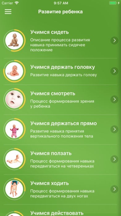 - Раздел описания развития навыков, таких как - умение ползать, держать спинку, ходить, держать головку, видеть, действовать ручками с подробным описанием и подсветкой того, как малыш должен был продвинуться в каждом из них на текущий момент. Также здесь описывает процесс общения с ребенком, развитие у него игровых навыков