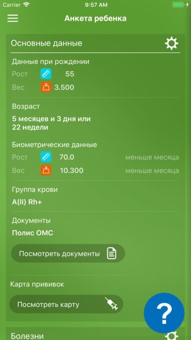 - Раздел «Анкета на сегодня» содержит главную актуальную информация по ребенку за весь период: аллергии, серьезные болезни, последние биометрические данные, группа крови, а также размеры одежды, которые ему сейчас подойдут. Добавив в программу часто используемые документы ребенка (полис ОМС, свидетельство о рождении и т.д.) Вы легко сможете просмотреть их через этот раздел. Т.о. эти, часто требуемые, документы будут всегда у Вас под рукой.