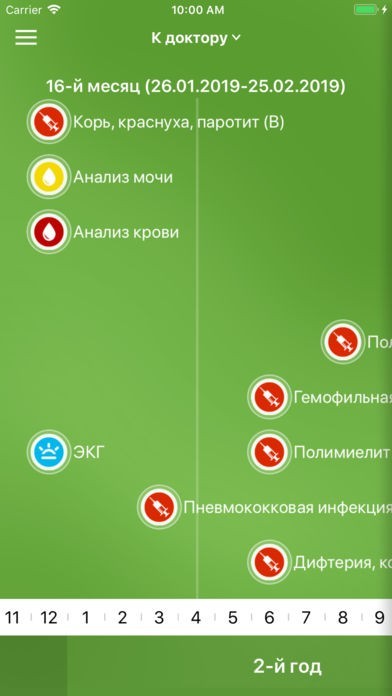 - Раздел "К доктору" поможет Вам не забыть об обязательных наблюдениях у врача и прививках. Исходя из указанного дня рождения малыша, программа будет подсвечивать те мероприятия, которые нужно совершить в текущий период и даст возможность пометить те из них, которые Вы уже прошли. В разделе так же содержится информация о болезнях, от которых делаются прививки.