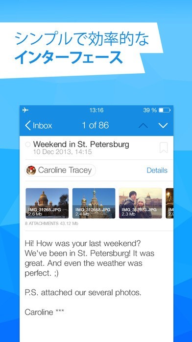 完全無料のEメールアプリケーションです。スパムフィルターで迷惑メールも完全ブロックしてくれます。メールの受信、送信、転送はもちろんでき、写真やドキュメントのシェアもらくらくです。