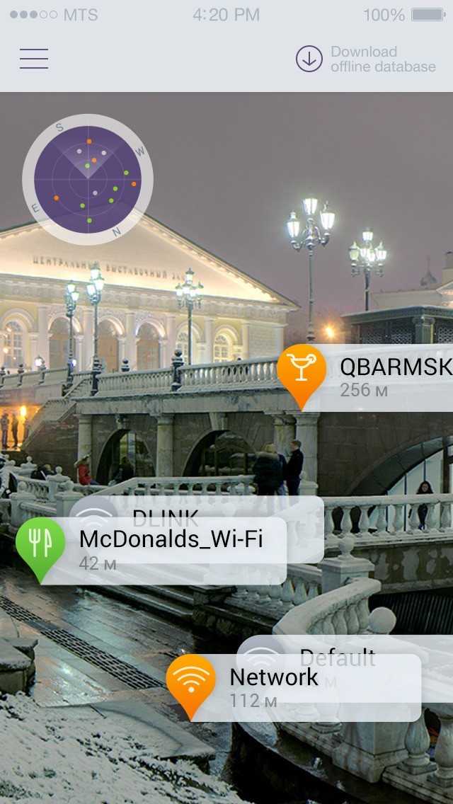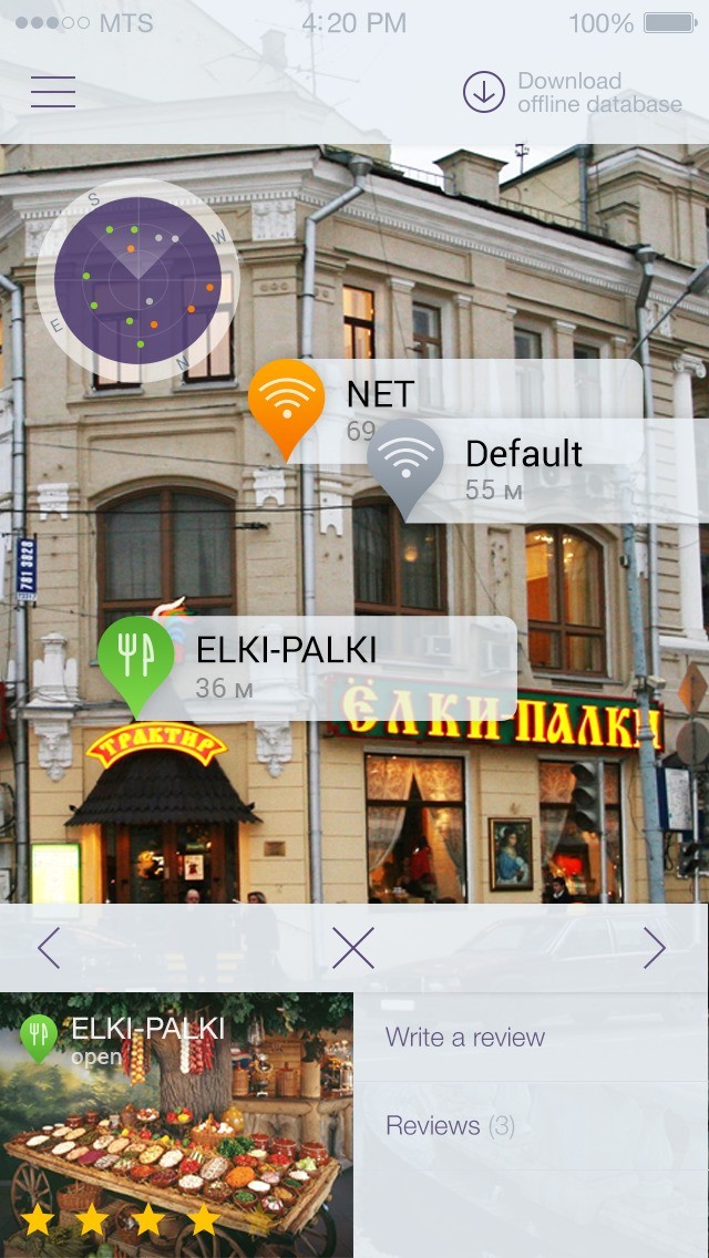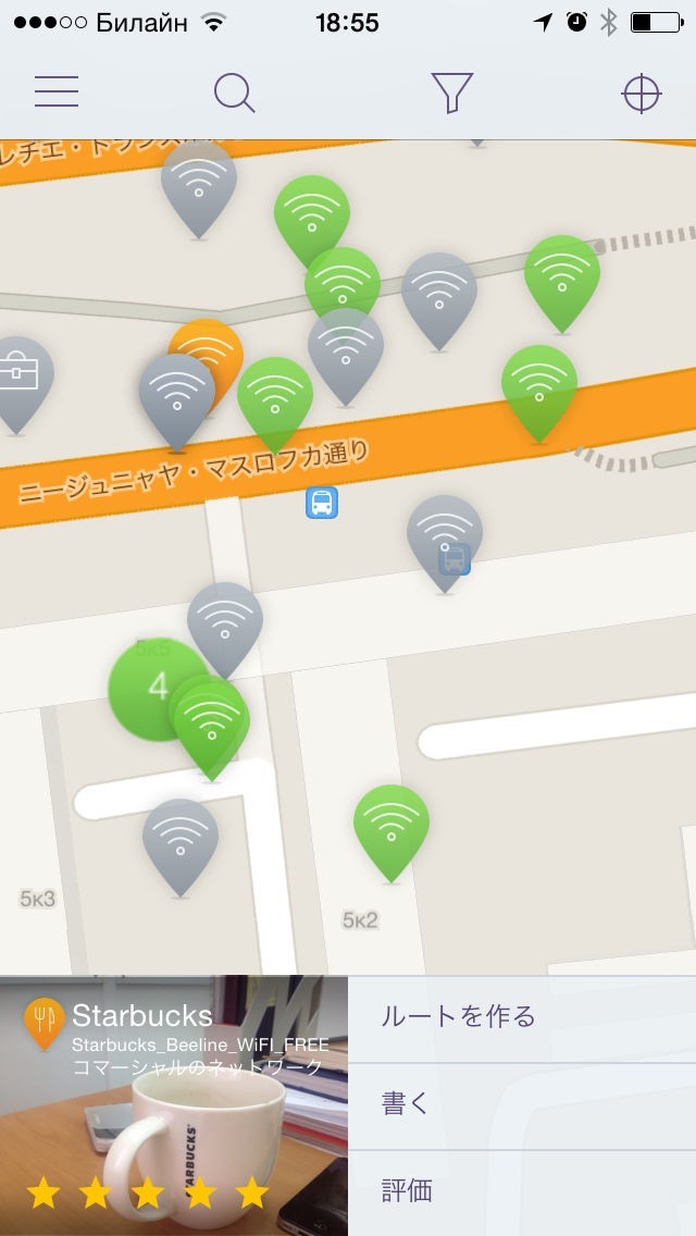「osmino」のトップ画面ではWi-Fiスポットをサーチすることが出来、バックグラウンドプロセスでスポット検索を行えるので、他のことをしながらでも常に探し続けてくれます。 そして、発見したら見つかりました!と表示されるので、タップするとその場所の飲食店、カフェなどのカテゴリやそこまでの距離などが拡張現実の世界に表示されるので、スマートフォンをかざしながら移動することによって見つけ出すことが出来ます。 他には地図上にアイコンが記載されてそこまで地図を見て行くというようなことも出来、「ルートを作る」ではどこで曲がってどこを通るなどを細かく設定することも出来ます。