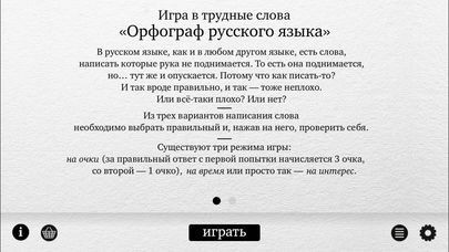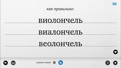 Игра представляет собой набор из 120 карточек. На каждой карточке приведены три варианта написания общеупотребимого слова русского языка, в котором чаще всего делают ошибки. Из трех вариантов только один — правильный. Необходимо догадаться, какой именно, и, нажав на него, проверить себя.