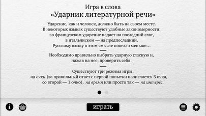 Игра представляет собой набор из 120 карточек. На каждой карточке приведено общеупотребимое слово русского языка, в котором чаще всего неправильно ставят ударение. Необходимо правильно выбрать ударную гласную и, нажав на нее, проверить себя.