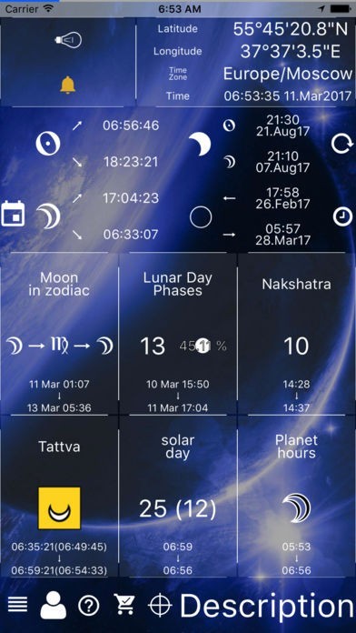 本アプリにはカレンダー機能が搭載されているため、いつでも簡単に過去や未来の月の情報を調べることができます。正確な計算で占星術などに必要な情報をいつでも入手できます。