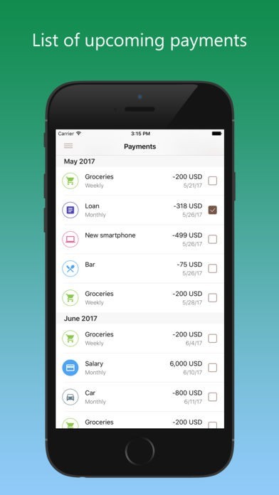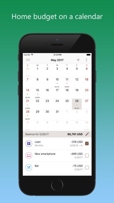With this simple budgeting tool you will be able to see your current and future financial situation right on the calendar. Entering periodic expenses and income is enough to see your estimated balance forecast for any date in the future. Add planned spendings to check whether you can afford it by specific date.