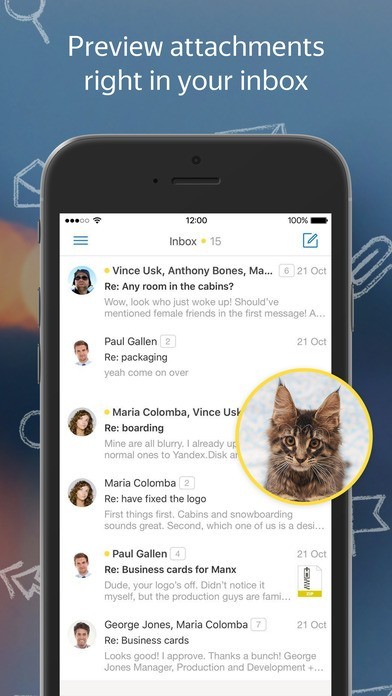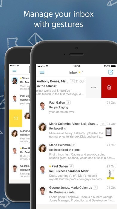 複数のアドレスをまとめて管理できるメールツール「Yandex.Mail」 メールアドレスごとに受信箱の切り替えが可能となっており、それぞれのアドレスで受信したメールを判りやすく整理できるのが特徴です。 不要なメールはスワイプするだけでさくさく削除できるのも嬉しいポイント。 グループ化機能によって同じ件名のメールは自動的にまとめてくれる他、画像などの添付ファイルはサムネイルの表示も行えるため、ファイルを開かずに内容を確認できるようになっています。