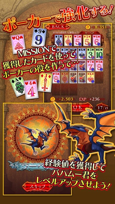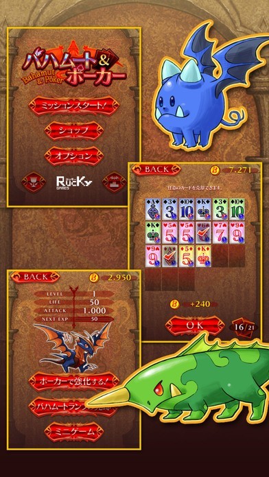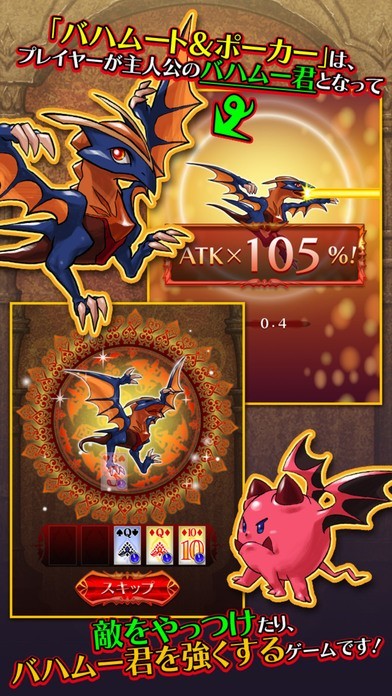 App Storeより引用「バハムート&ポーカー」は、プレイヤーが主人公のバハムー君となって、敵をやっつけたり、バハムー君を強化したりして遊ぶゲームです!