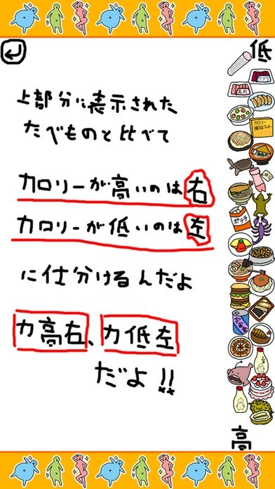 「カロリー仕分け 〜どっちが太る?〜」は、画面上部に表示される食べ物と比べて、カロリーが低いか高いか順番に仕分けていくアプリになっています。一度にたくさんの食べ物が出てきます。制限時間もあるので、じっくりと考えている時間はありません。最初は、一見すると似たようなカロリーに見えるものばかりが出てくるので難しいです。おまけ機能として、カロリー表示機能があるのでダイエットをしている方には参考になること間違いなしのゲームです。