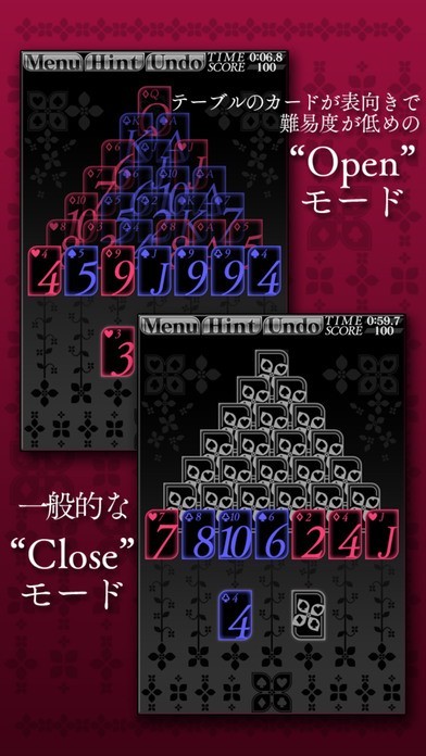 App Storeより引用「Pyramid」こと、ピラミッドは、テーブルもしくは山札のカードから2枚を組み合わせて合計13または合計14の数字にして遊ぶトランプゲームです。