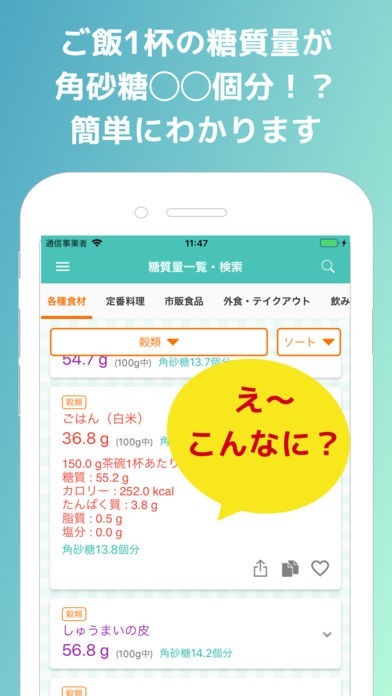 買い物に行った時に肉類や穀類などの原材料から調べたり定番料理や外食に含まれている糖質を確認してから購入することができるので買った品物から献立を考えたり栄養バランスを考えて買い物をすることができます。