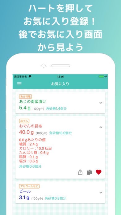 食べる時だけでなく普段から食材をチェックしておき糖質が低くくて食べたい料理や食べ物をハートマークをタップするとお気に入りに登録できるので後になって思い出せない時でも簡単に確認する事ができます。