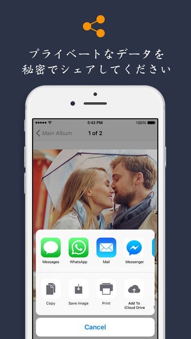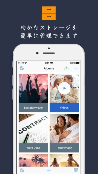 ビルトインカメラを使って写真撮影をしたり、既存の写真をカメラロールからアプリの秘密のホルダーに移動。安全なプライベートクラウドストレージがいつでも異なるデバイスからプライベートアルバムへアクセス可能にします。
