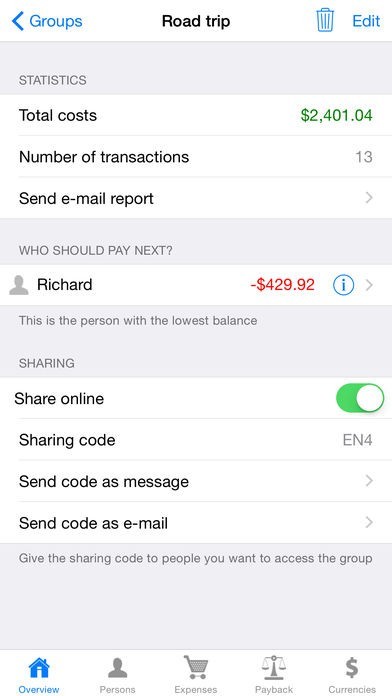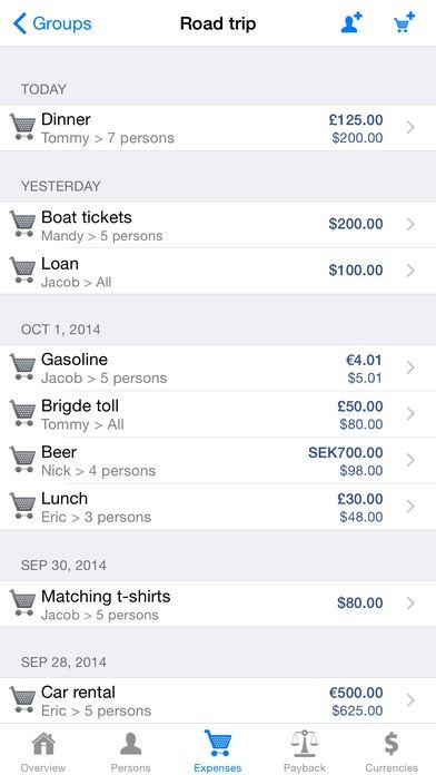 It is perfect on vacations, road trips, a night on the town or in a household where you share the costs. Just define a group of people, add expenses as you go and when you are ready to settle the debts, you can e-mail a report with a list of all expenses and who should pay what to whom.