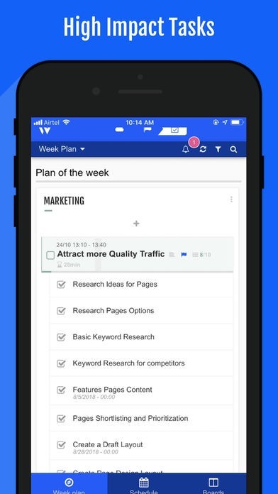 High Impact Tasks: Week Plan helps you to integrate all your high impact tasks into your schedule easily.