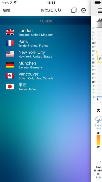 アプリを開くと、スクリーンの下に向こう6日間の週間天気予報を表示させることができます。現在の居場所や世界中の110000以上の都市のデータから選択することができます。