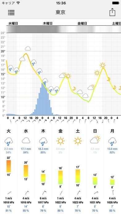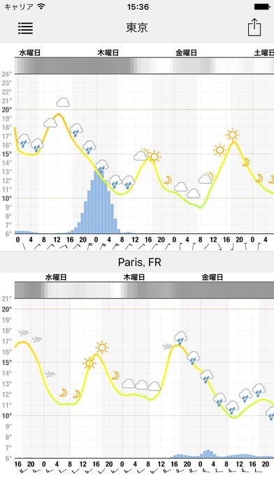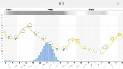 このアプリでは、向こう48時間の天気、気温、湿度、風速などの詳細な天気の情報を表示したグラフを見ることができます。お天気アプリの中では特に見やすく、当たるのでおススメです。