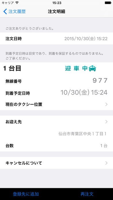 5.タクシーの手配が完了した時点で、タクシーの無線番号、到着予定日時をお伝えします。これで注文は完了です。