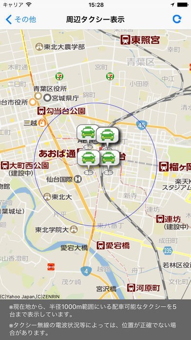 4.[その他] [周辺タクシー表示]機能を使って、現在地から半径2000m以内にいるタクシー位置を把握することができます。