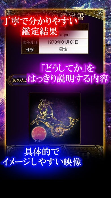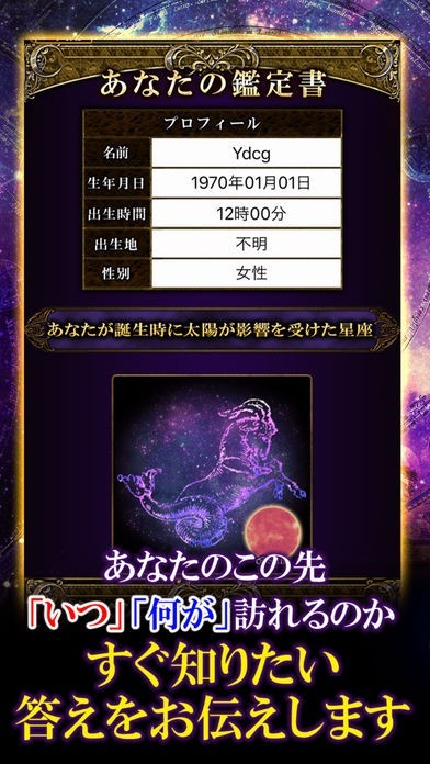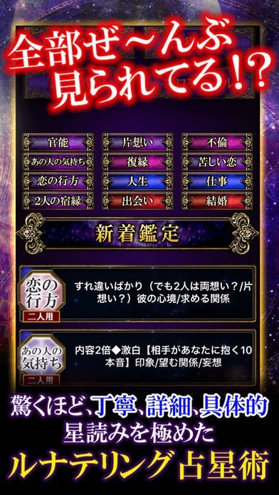 App Storeより引用今までのこと、今の自分、これからのこと……全部全部見られてる!”驚かれるほど丁寧、詳細、具体的星読みを極めた「ルナテリング占星術」があなたの運命を読み解き、真の幸せを掴めるよう導きます。