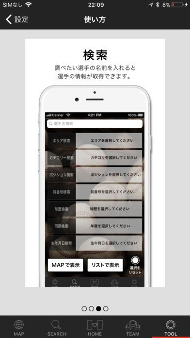 検索タブから選手の情報を調べることも可能です。名前を入れて検索や、球団別一覧やポジション別に検索することもできます。その他に背番号から検索することもでき、名前がわからなくてもすぐに情報を調べられます。