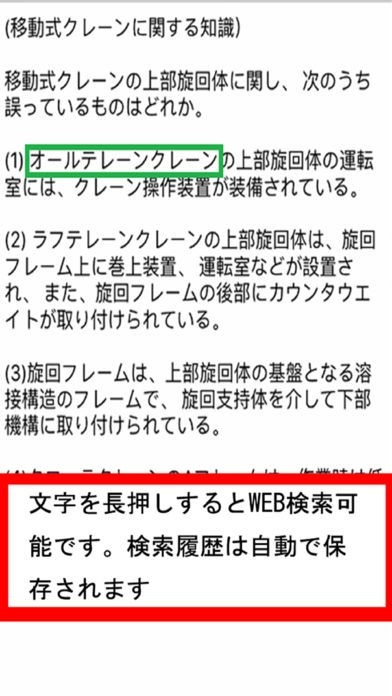 クレーン・デリック運転士(クレーン限定)はクレーンの運転士の試験の過去問が収録されており全問に検索機能があってワンクリックで単語のWEB検索ができて正確な解答の解説を見る事ができます。