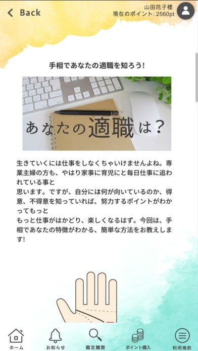 このアプリでは無料で簡単に本物の手相占いを体験できます。やり方は簡単、手のひらの写真を撮影して、「鑑定する」ボタンを押すだけです。性格や才能、健康状態などを鑑定できます。