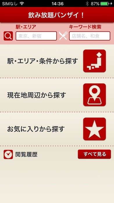 「飲み放題バンザイ」グルメ情報検索アプリのスクリーンショット