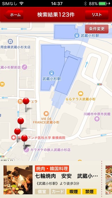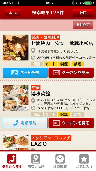 迷った時に現在地から探すことも、駅、エリア、条件をそれぞれ指定して探すことも出来る!