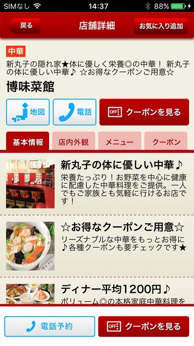 このアプリは飲み放題のサービスを利用することが出来るお店に絞って紹介してくれるので、お酒を飲むのが大好きな方にとって有益な情報が得られます。 様々な条件で検索することが出来るので、お目当てのお店を見つけることが出来るでしょう。 検索結果によってマップには赤いピンが立てられておりそれをタップすれば店舗詳細を見ることができます。 食べ物の写真やワンタップで電話をすることが出来る機能があるだけではなく、クーポンをチェックすることができお店によってはかなりの恩恵を受けることが可能になります。 他にもネット予約をすることができたり、気にいたものは右上のお気に入りに追加をタップすることで次回からはすぐに見れます。 お店がどこにあるのかよく解らなくなった場合には店内外観でお店の様子を把握しておくことで解決出来ます。