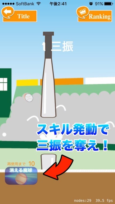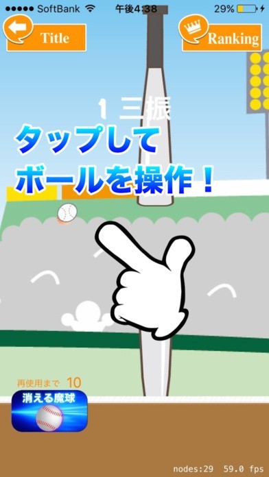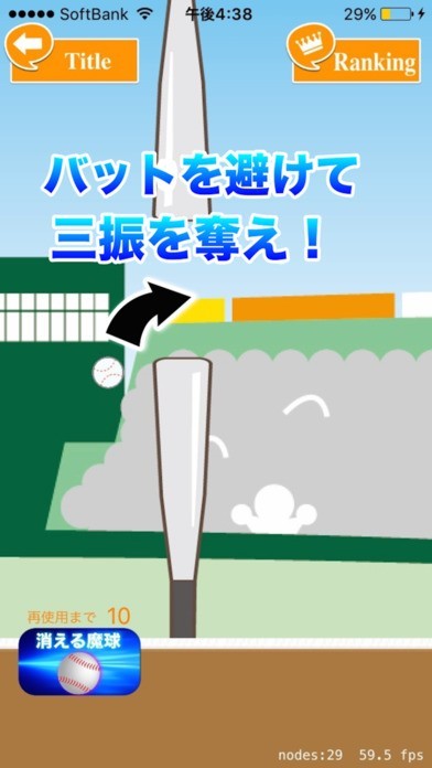 タップをするとボールが浮き上がるのが見事バットに当たらないように調節していく横スクロールゲームです。僅かでもバットに当たると即ホームランにされてしまいます。できるだけバットの遠くを通るようにしましょう。