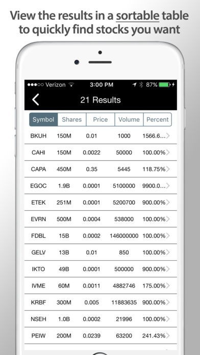 The results are displayed in a sortable table (another must-have). Sort by price, symbol, percent change and more!