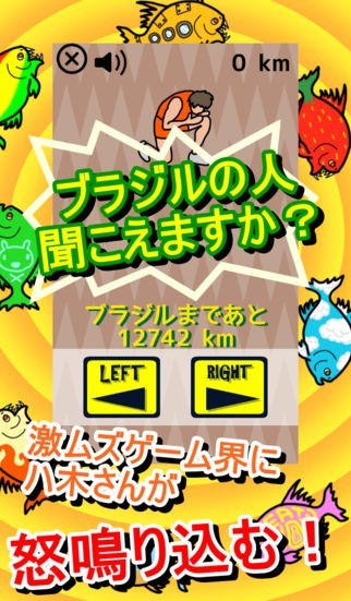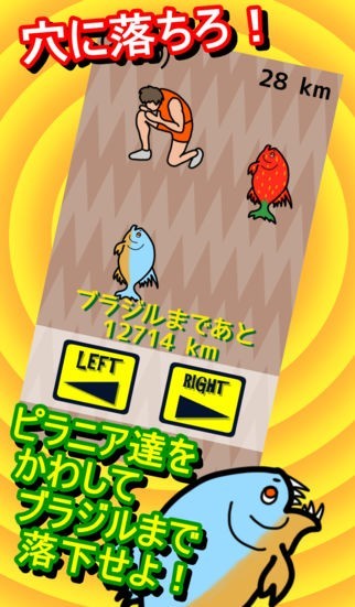 ブラジルへ続くと言われる穴に落ちてしまった八木さんを、ブラジルまで送り届けるゲームです。画面にぞくぞくと現れるピラニアを左右にかわしていくのが、シンプルながらもくせになります!