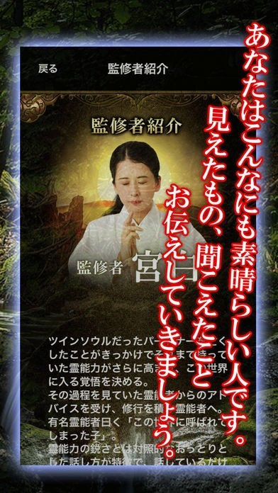 長年、神職に従事し体得したという霊視能力によって、あなたを守る守護霊や守護神たちから得た言葉を占いを通じて聞くことができるという。今、あなたに迫る危機は何なのか、あなたを悩ませるものは何なのか、霊能巫女・宮白に鑑定してもらおう。