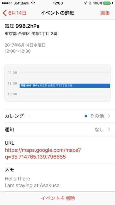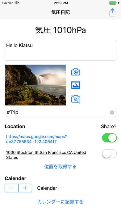 気圧の数値を計測することができ、変動を数字で確かめることができます。また計測した場所をGPSで住所を取得すれば、アプリ内からSNSなどへとその気圧情報を拡散することができます。